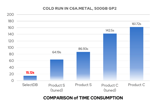 In the test results running on the machine of c6a.metal, 500gb gp2 which was another common type, the overall query time of SelectDB in the Cold Run scenario was only 1/4 to 1/10 of that of similar products. Without any tuning, the highest query performance was nearly 11 times higher than that of similar products, showing a huge leading edge.