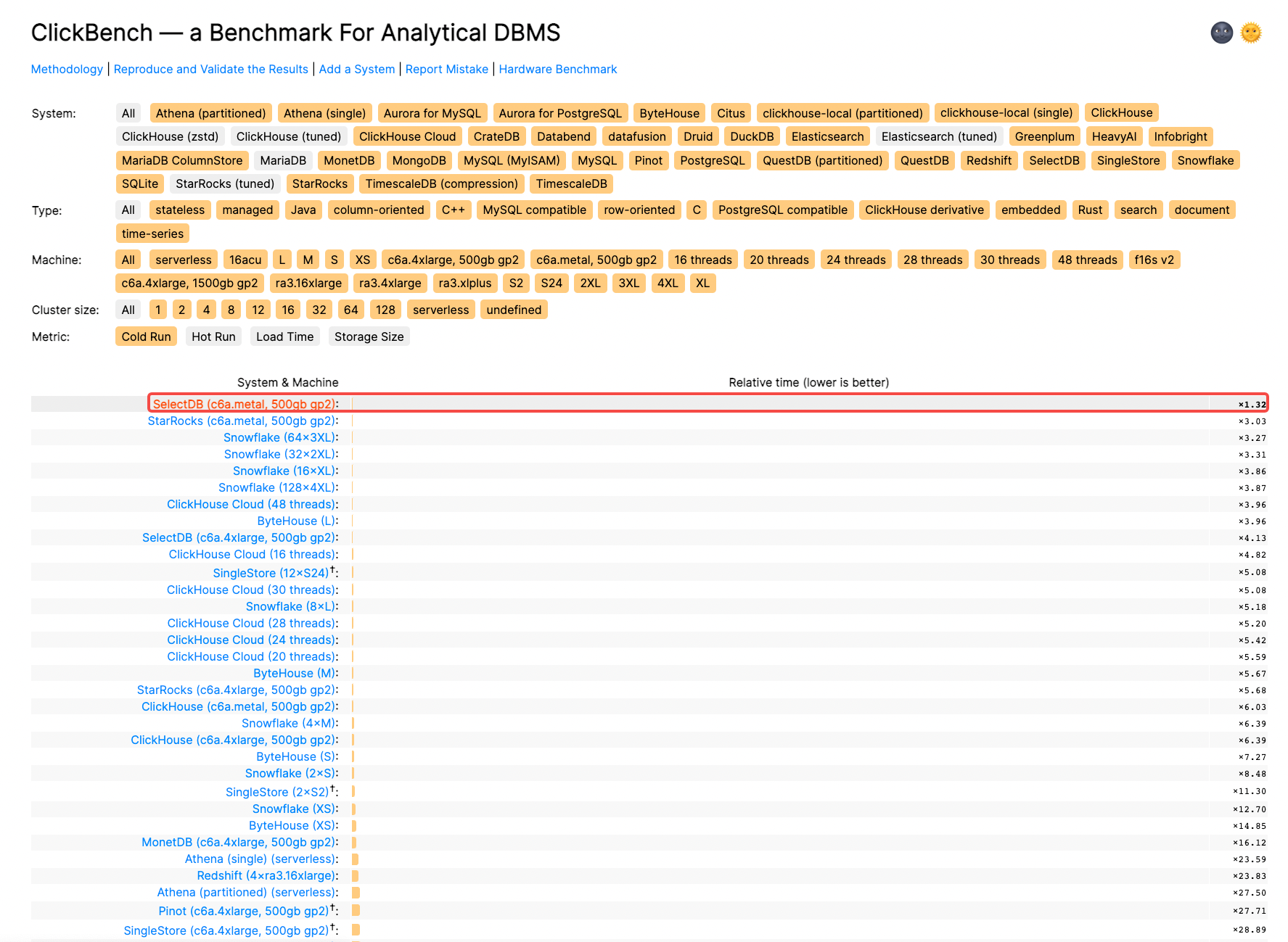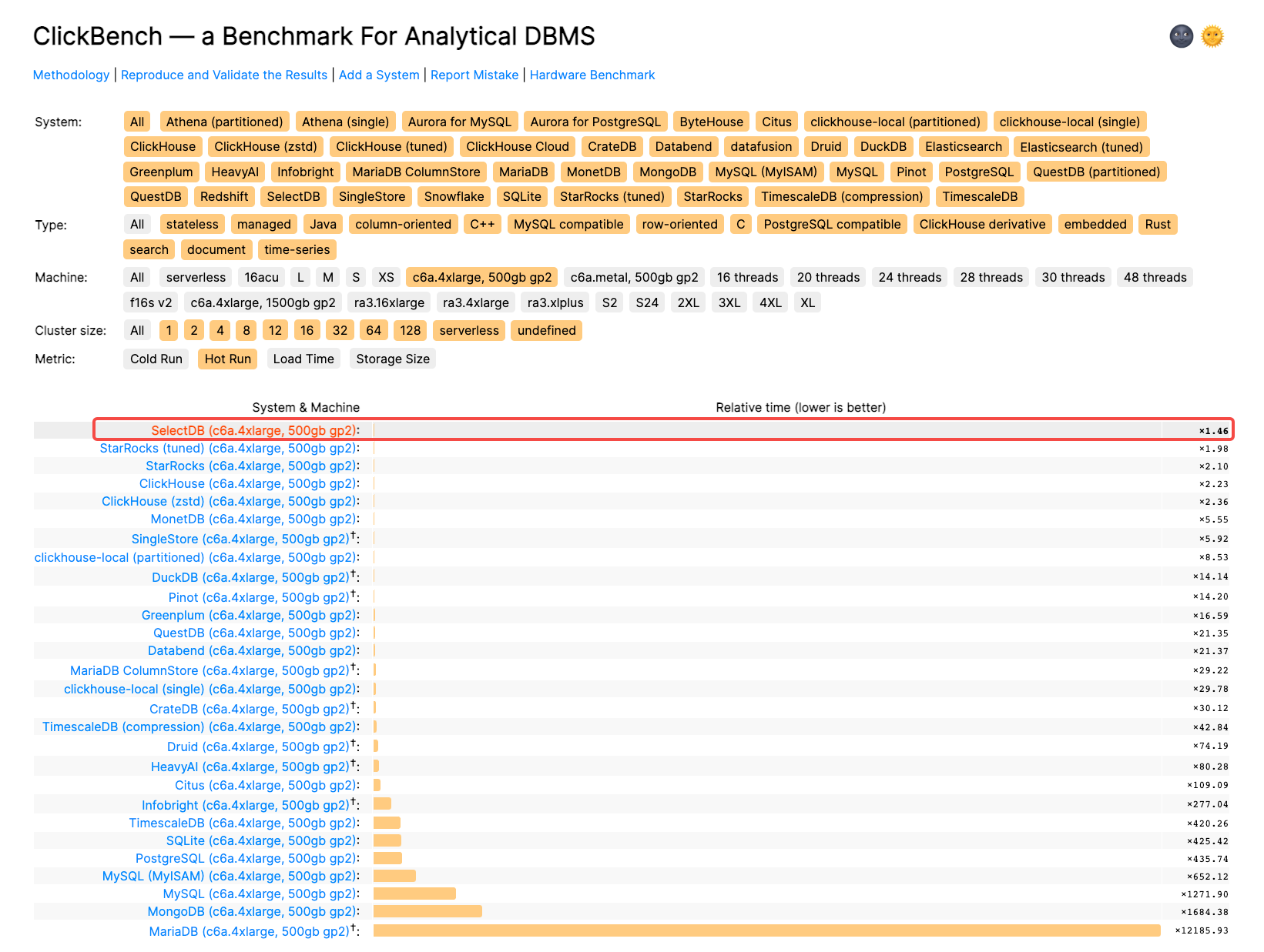 The cloud-native realtime data warehouse SelectDB recently reached the top 1 of ClickBench which is a global benchmark for analytical databases launched by ClickHouse, showing its high performance in the world. It runs on c6a.4xlarge VM in AWS with 500 GB gp2 by default, surpassing a number of global top products by leading in a lot of indicators.