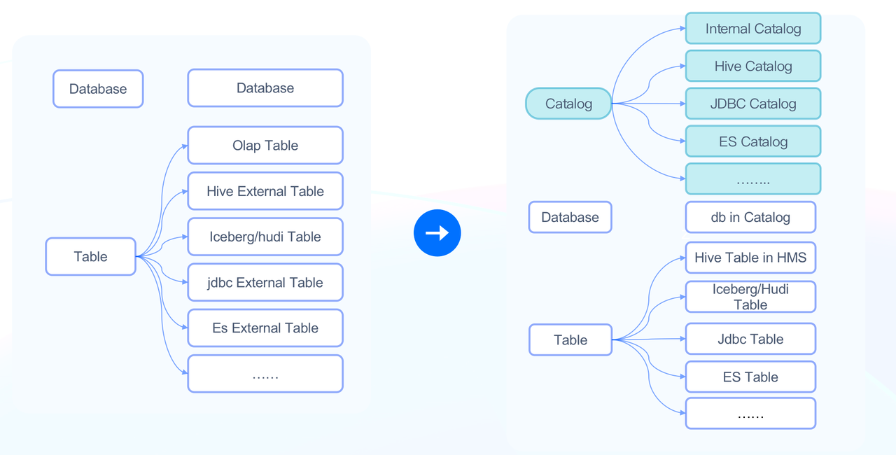 Older versions of Doris support a two-tiered metadata structure: database and table. As a result, users need to create mappings for external databases and tables one by one, which is heavy work. Thus, Apache Doris 1.2.0 introduced the Multi-Catalog functionality. With this, you can map to external data at the catalog level, which means: