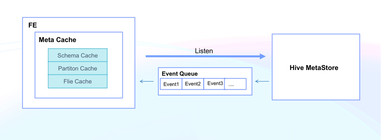 Doris enables high efficiency in metadata access by Meta Cache, which includes Schema Cache, Partition Cache, and File Cache. This means that Doris can respond to metadata queries on thousands of tables in milliseconds. In addition, Doris supports manual refresh of metadata at the Catalog/Database/Table level. Meanwhile, it enables auto synchronization of metadata in Hive Metastore by monitoring Hive Metastore Event, so any changes can be updated within seconds.